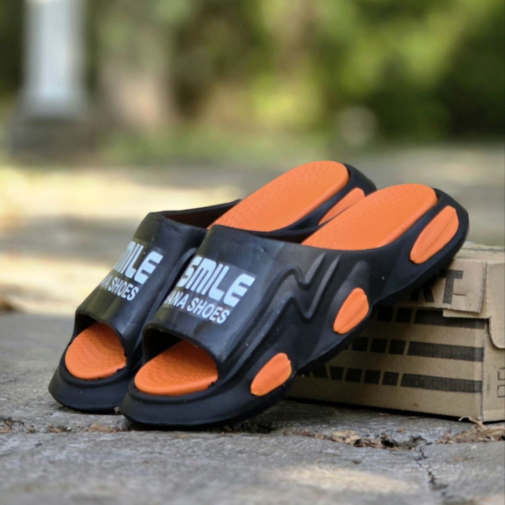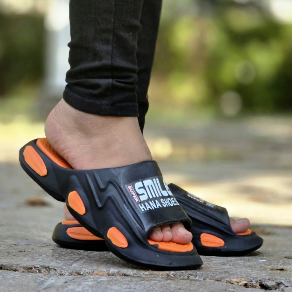 تخفیف دمپایی صندل مردانه و پسرانه مدل فشیون طرح smile چشم گیر و زیبا رنگ مشکی نارنجی ارسال رایگان.